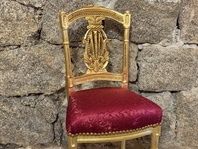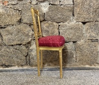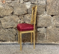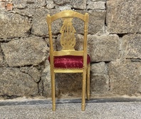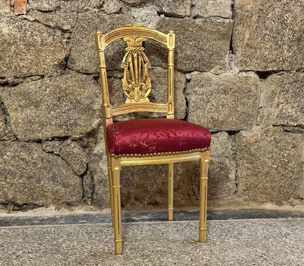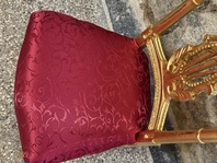 Zlatá židle s vínovým látkovým potahem, dřevěná vyřezávaná zlacená konstrukce, výška 89 cm, přední šíře 43 cm, výška k sedáku 50 cm, šíře opěradla 35 cm, hloubka sedáku 36 cm, hezký stav. Top dekorativní kus.