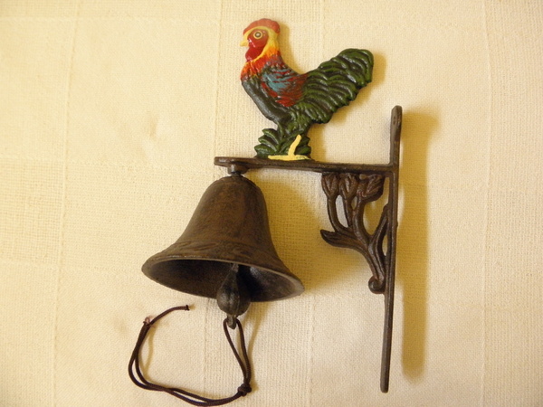Zvon na ozdobné konzoli - kohout, vše z kovu, výška celkem 25 cm, šířka konzole - 3,5 cm, průměr zvonu 10 cm, výška zvonu 7 cm, váha celkem 0,85 kg, nádherný pronikavý zvuk.